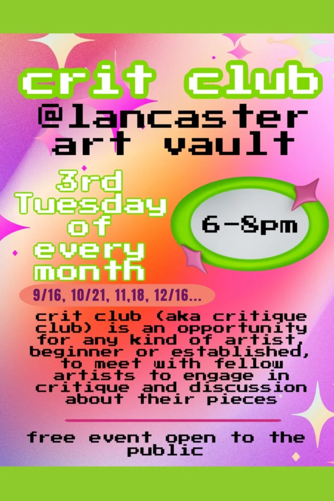 Critique Club is a welcoming space for artists of all levels — from beginners to established professionals — to bring in their artwork for feedback and discussion. The club is not just about receiving critique; it’s also an opportunity to engage thoughtfully with fellow artists, share perspectives, and grow together through open conversation about each other’s work. We hope you will join our supportive community!