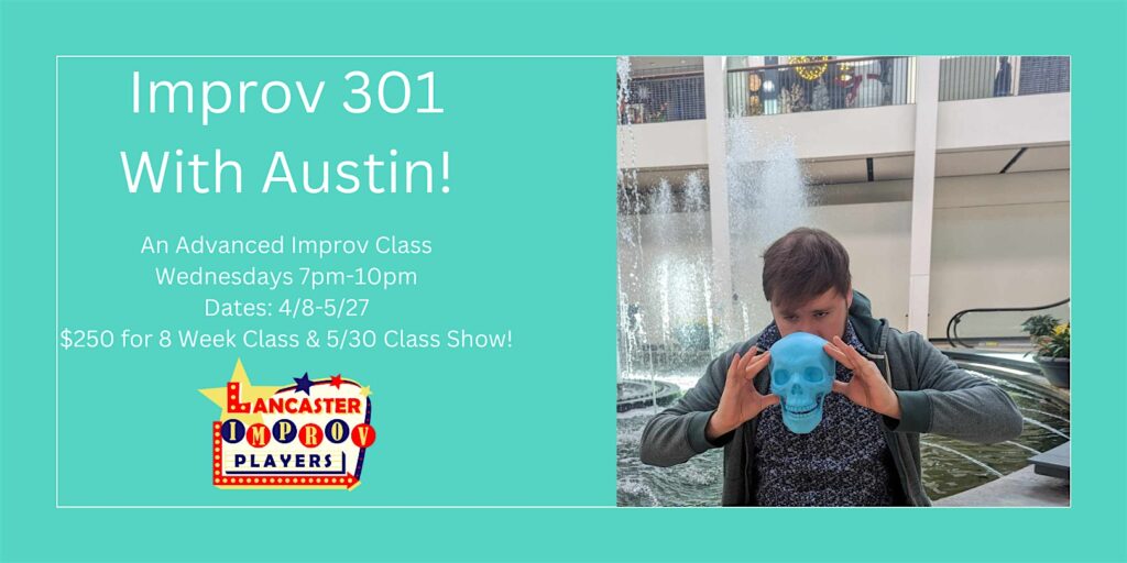 About the Teacher: this class will be taught by Lancaster Improv Player’s own Artistic Director: Austin Rittle. Over the last 12 years, Austin has performed in more than four hundred improv shows and is a graduate of the Philly Improv Theater’s curriculum. Generally you will find Austin performing at LIP or cooking up a new show idea for the theater. Austin is a founding member of the Lancaster Improv Players and wants to continue to make Lancaster a funnier place through teaching what he loves. He makes the best salsa in Lancaster City.