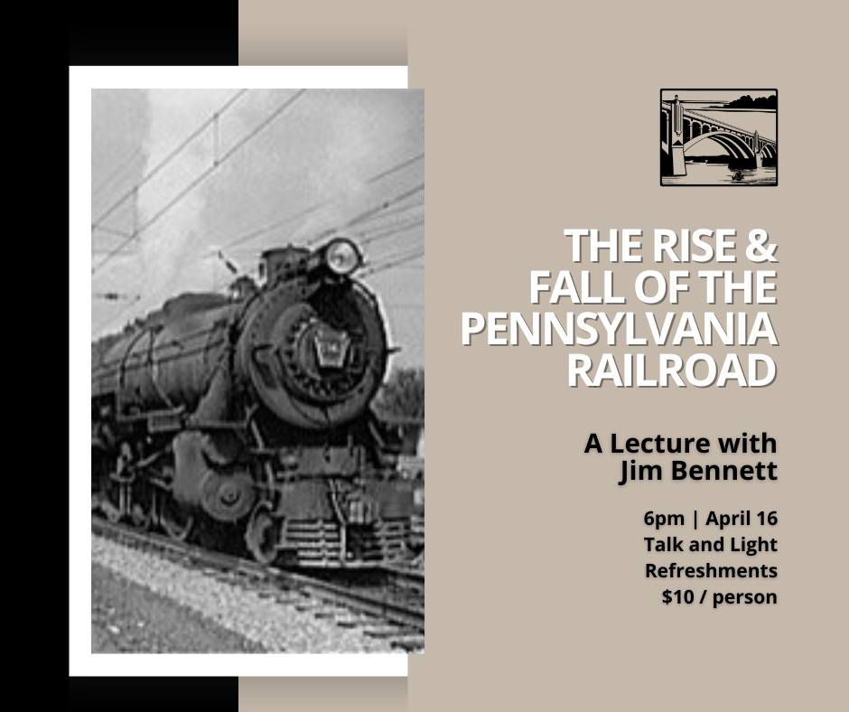 Join local historian and train enthusiast Jim Bennett for his presentation, “The Rise and Fall of The PA Railroad” at Columbia Crossing River Trails Center on Thursday evening April 16, 2026. The PA Railroad fueled industry and contributed to the growth and development of York and Lancaster Counties. Learn about the Pennsylvania Railroad’s history. This presentation will highlight The PA Railroad’s start and its rise, as it became the standard for America’s railroads, and finally its eventual demise.