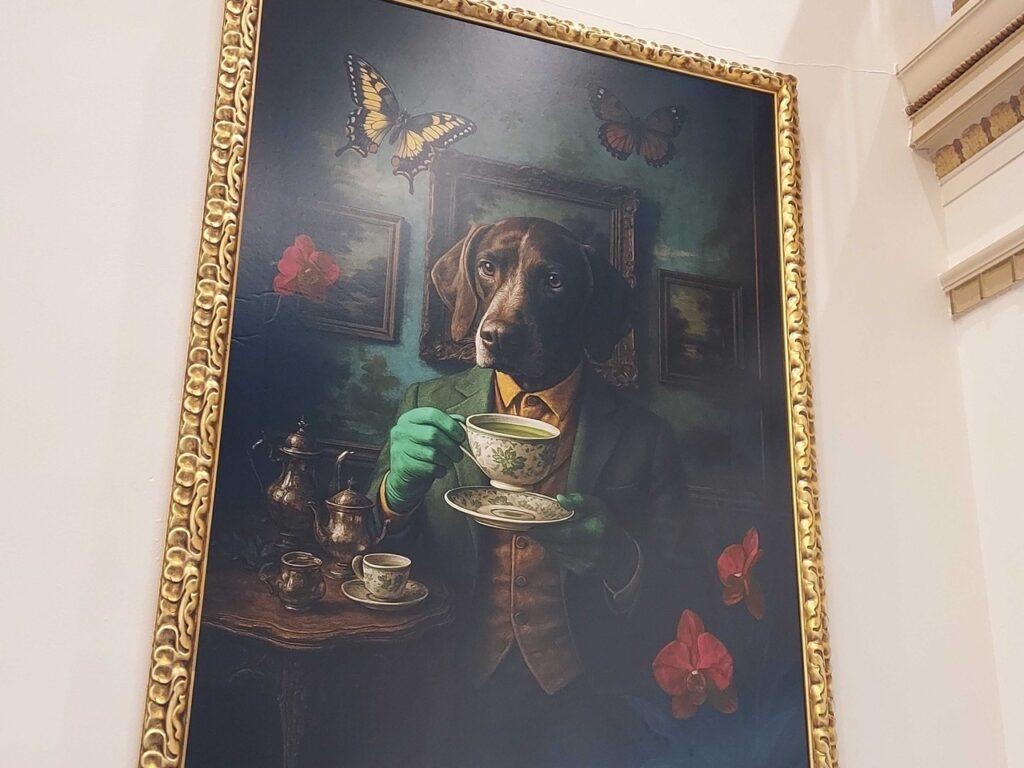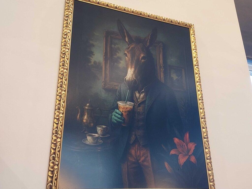 The artwork hanging from the walls contains large portraits with elaborate, golden frames, where, in a historic building like this, you would expect to find a painting of a founder or big-pocket donor. Instead, you find a dog sipping matcha and a mule sipping iced coffee. I asked Andrew about the artwork.