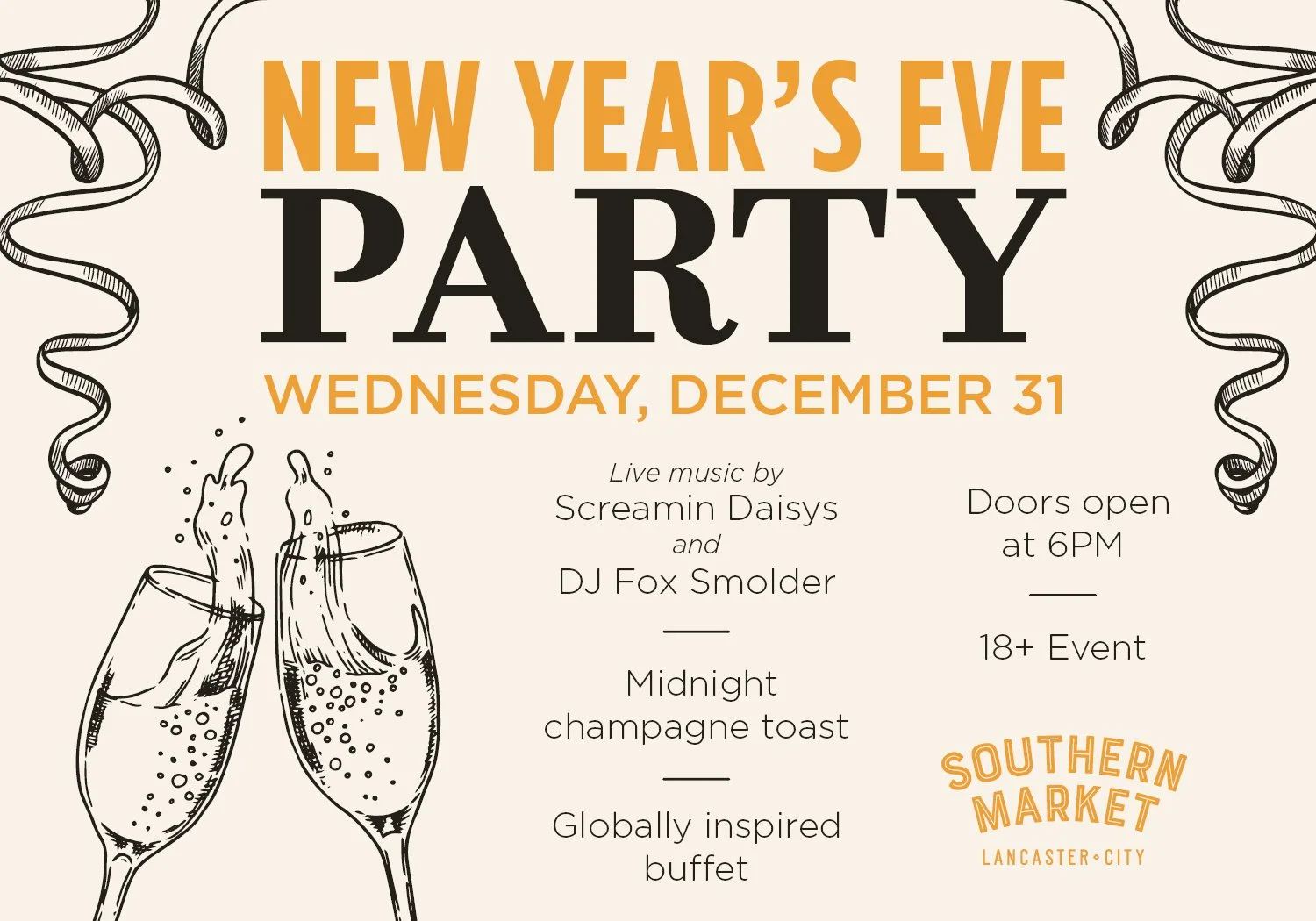 Southern Market 100 South Queen Street, Lancaster, Pennsylvania, United StatesNYE at Southern Market: DJ Fox 7–10pm, Screamin Daisys 10pm–12am, buffet 7–9pm, champagne toast at midnight (21+). More info: https://www.southernmarketlancaster.com/happenings/southern-market-new-years-eve-party-2025-26